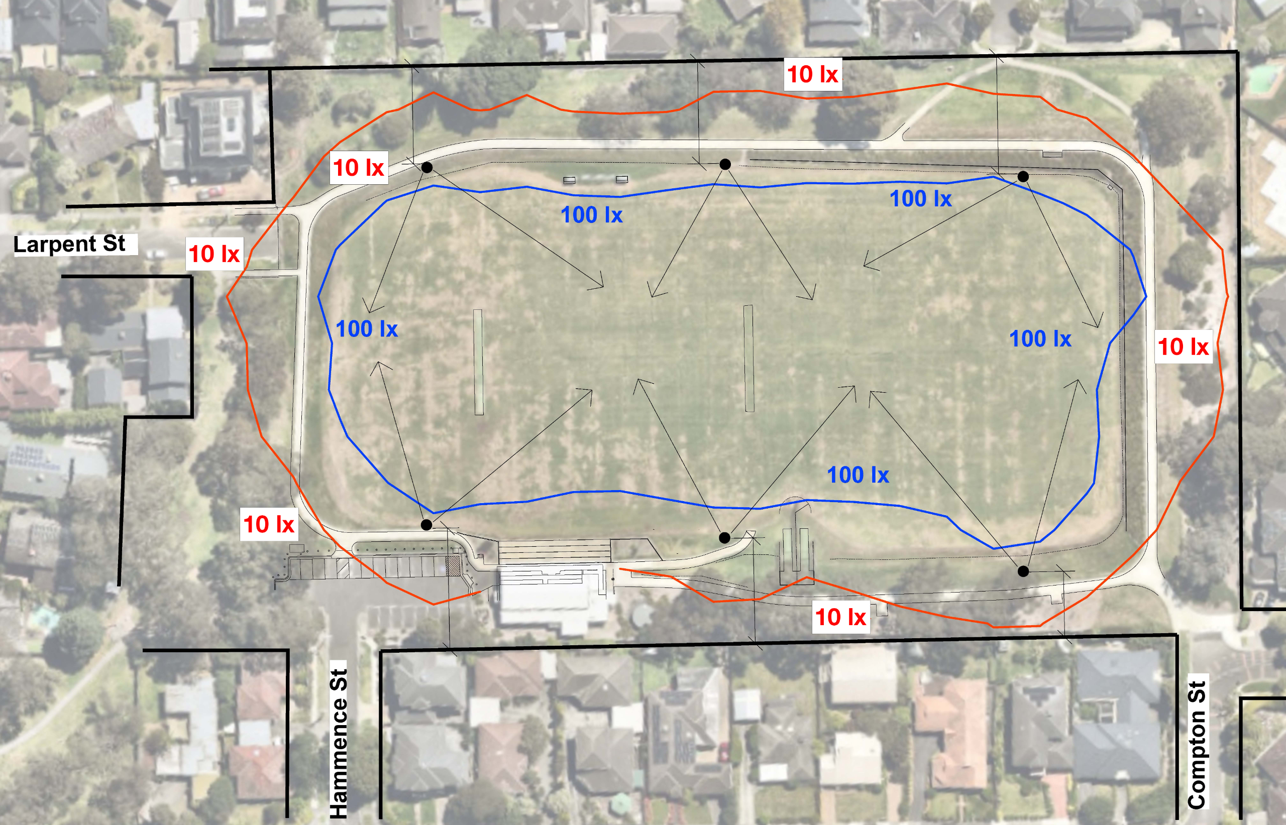 The proposed lights will deliver at least 100 lux (lx) on the soccer pitch to meet the required standards for community sport. The design also complies with the Australian Standard for managing the obtrusive impact of outdoor lighting (AS/NZS 4282:2023), and no more than 10 lux will be spilled into residential properties.